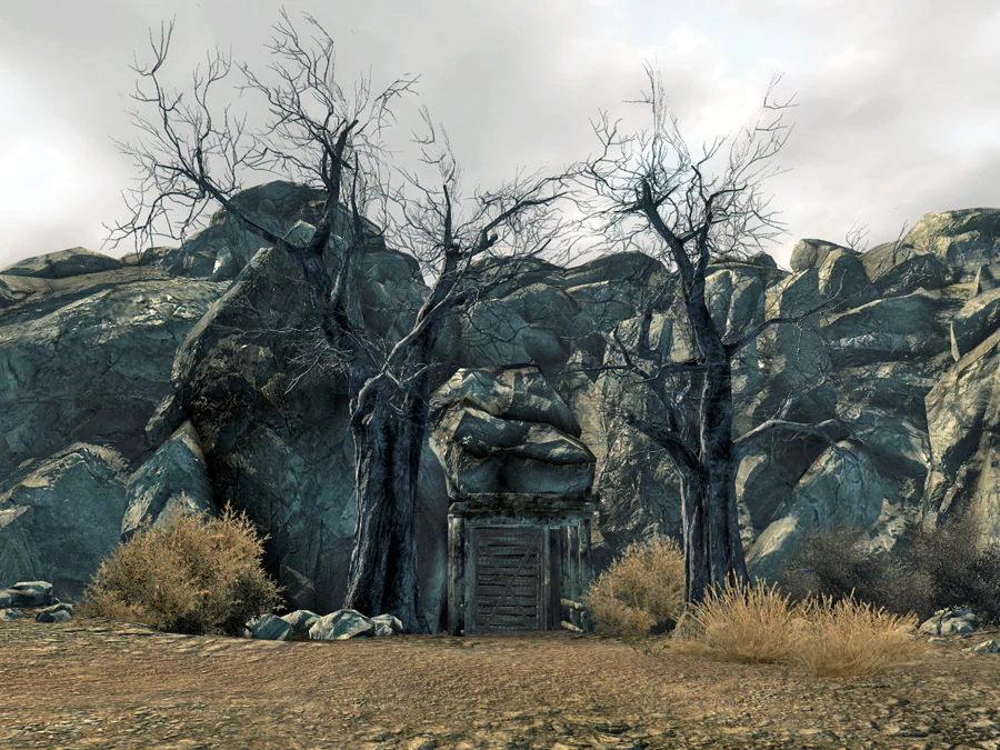 Убежище находится посреди плоской пустоши, на которой нет никакой растительности. Просто голая земля, камни и редкие сухие кусты.